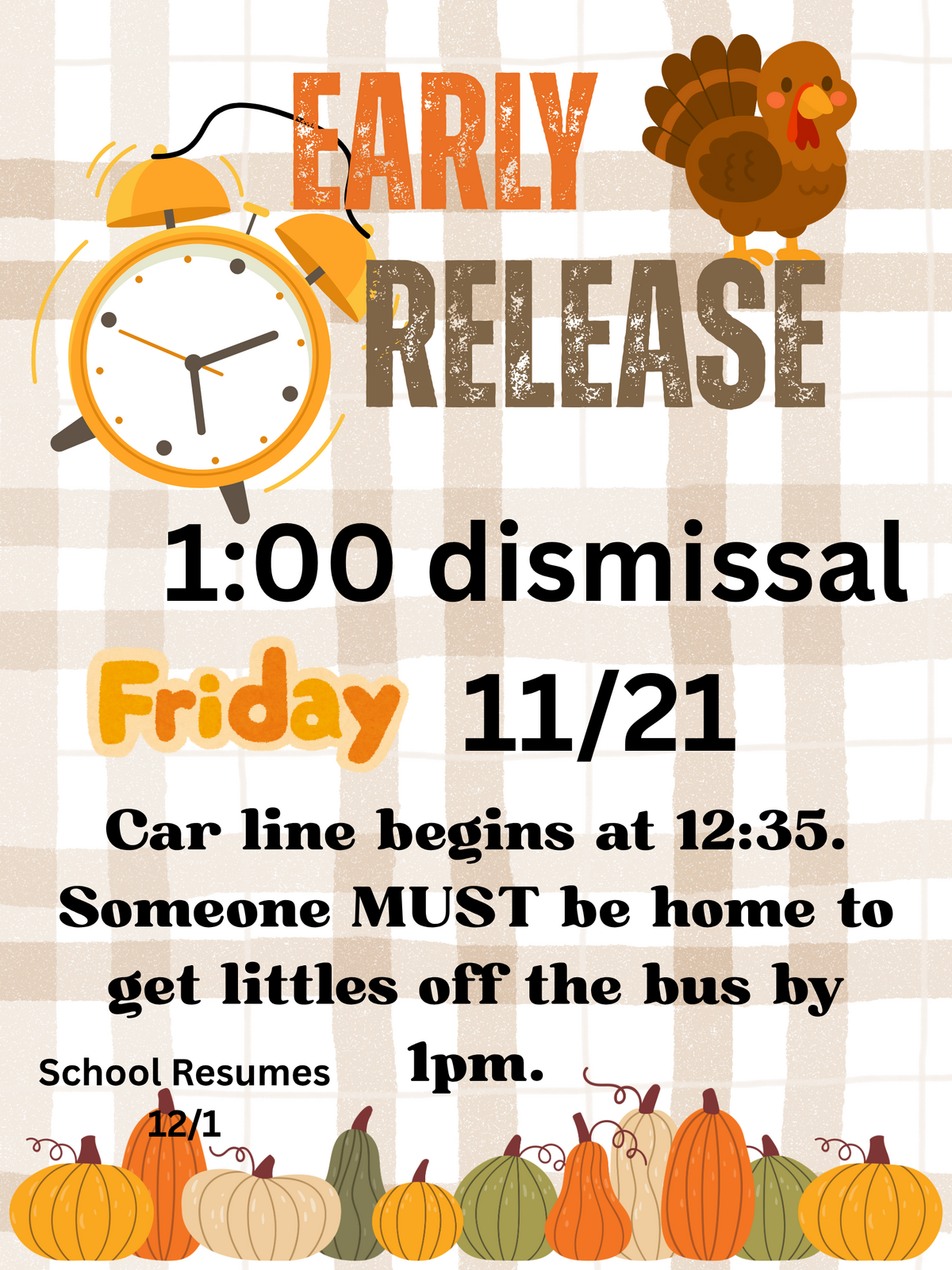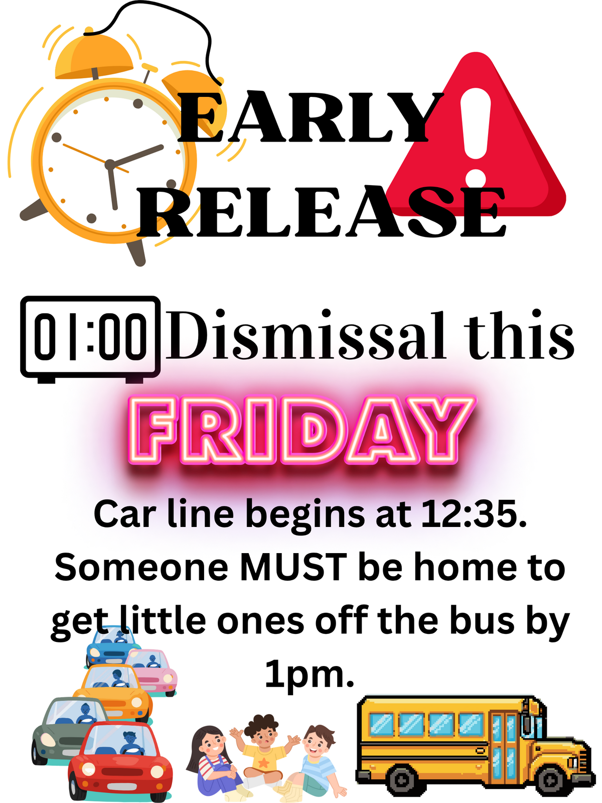 Reminder: We release at 1:00 THIS FRIDAY. Car line will begin at 12:35 and end about 1. Someone MUST be home to get littles off of the bus BEFORE 1:00pm.